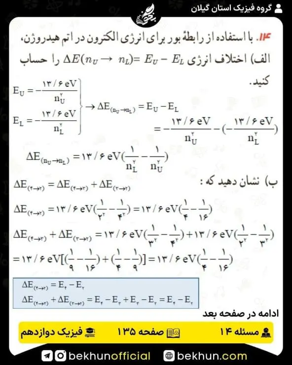 الف) nعدد کوانتومی است که نشان دهنده شماره مدار مجاز الکترون به دور هسته است و n=1 پایین ترین تراز انرژی است که مربوط به مدار اول است که به آن حالت پایه گفته میشود. انرژی هر تراز به معنای مقدار انرژی است که الکترون با آن مقدار انرژی به هسته مقید است و برای جدا کردن الکترون باید به اندازه انرژی آن تراز به الکترون انرژی بدهیم تا از قید هسته رها شود و علامت منفی هم به همین دلیل است.