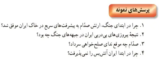 جواب سوال 2: چون ایران به دلیل مسائل و مشکلات بعد از انقلاب، انسجام لازم را در نیروهای نظامی خود نداشت و آمادگی مقابله با یک جنگ بزرگ را پیدا نکرده بود.