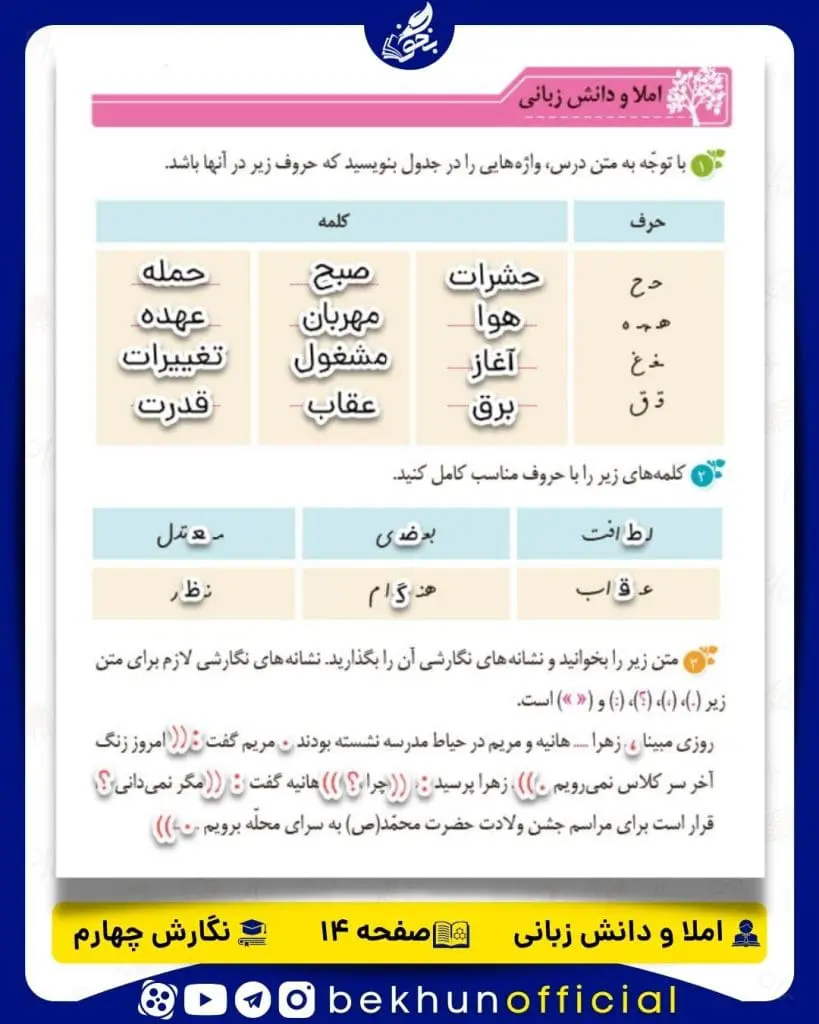 جواب املا و دانش زبانی صفحه 14 نگارش چهارم