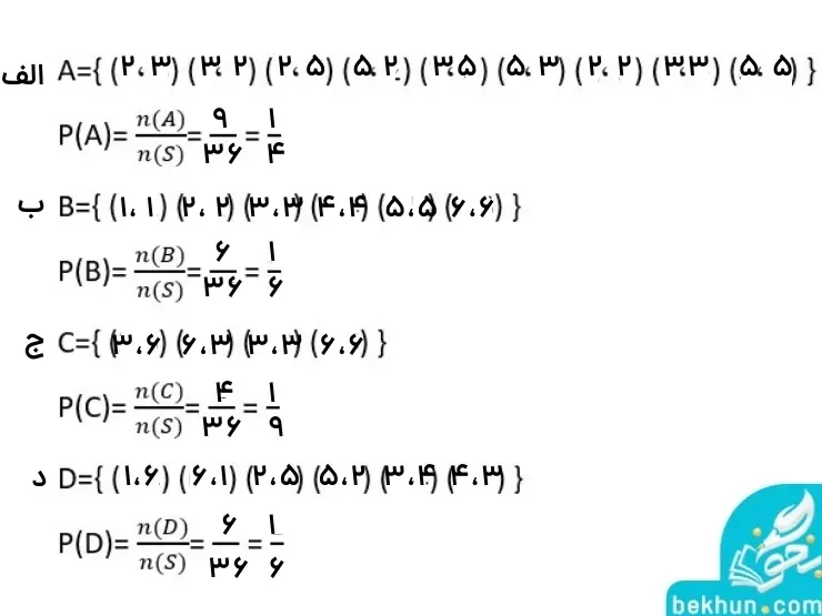 پاسخ 1: وقتی تاسی را میاندازیم شش حالت ممکن است اتفاق بیافتد که عبارتند از 1 و 2 و 3 و 4 و 5 و 6 بنابراین: S={1،2،3،4،5،6} و n(S)=6. ادامه پاسخ را در عکس زیر میتوانید مشاهده کنید.