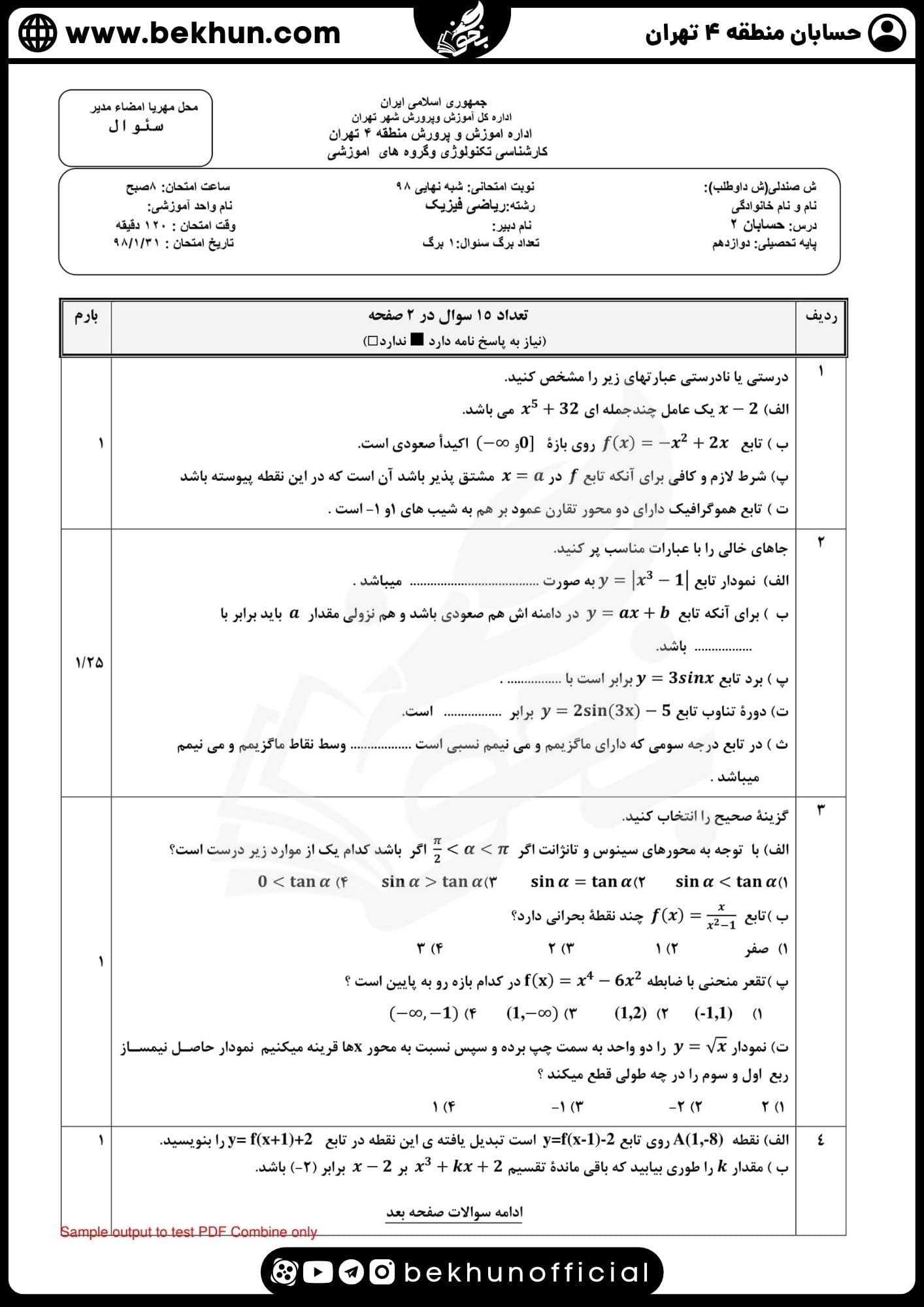 نمونه سوال حسابان دوازدهم نهایی با جواب منطقه 4 تهران