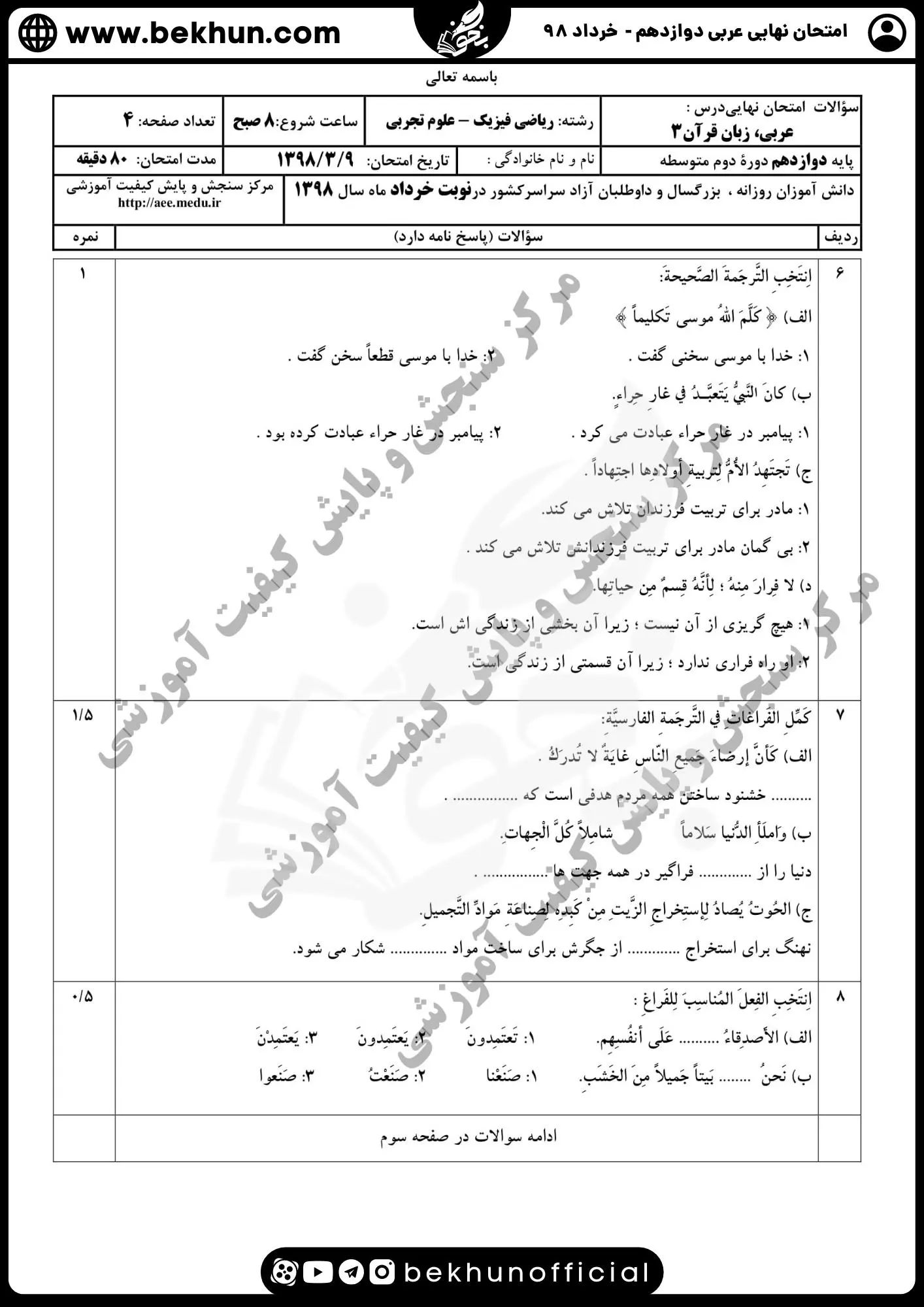 دانلود PDF نمونه سوال امتحان نهایی عربی دوازدهم تجربی با پاسخ شهریور 98