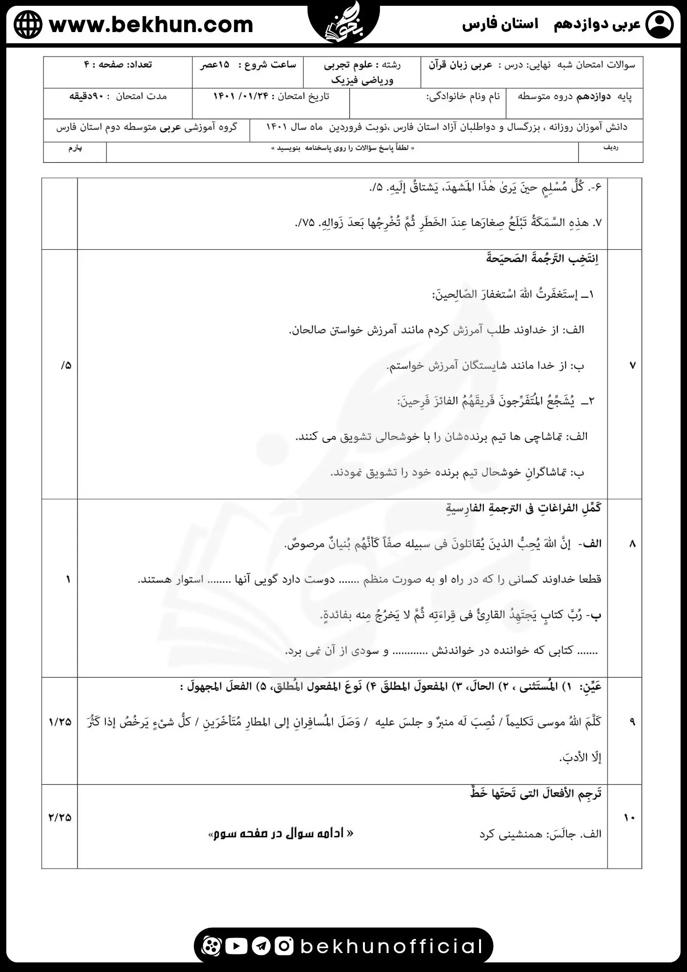 نمونه سوالات امتحان نهایی عربی دوازدهم با جواب استان فارس