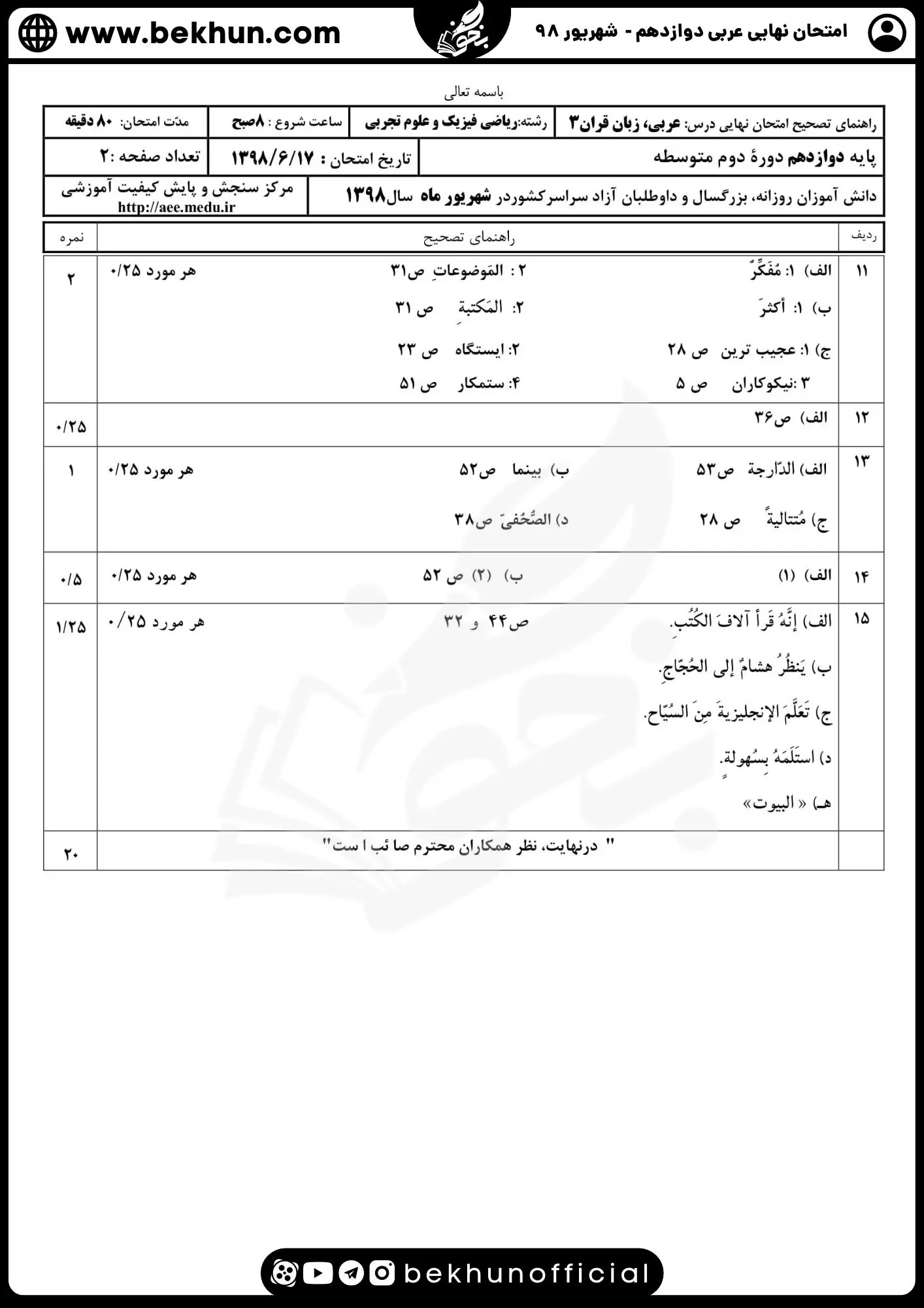 نمونه سوال امتحان نهایی عربی دوازدهم با پاسخ شهریور 98