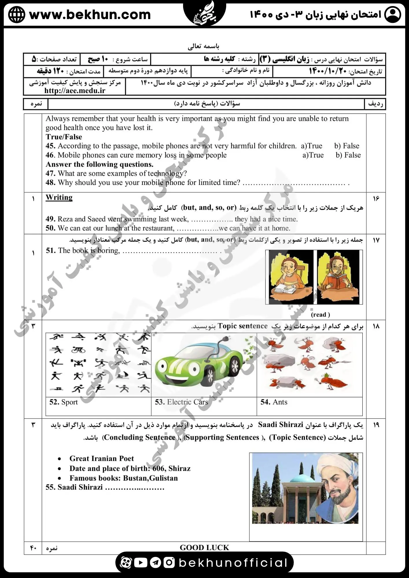 سوالات امتحان نهایی زبان انگلیسی دوازدهم شهریور 1400