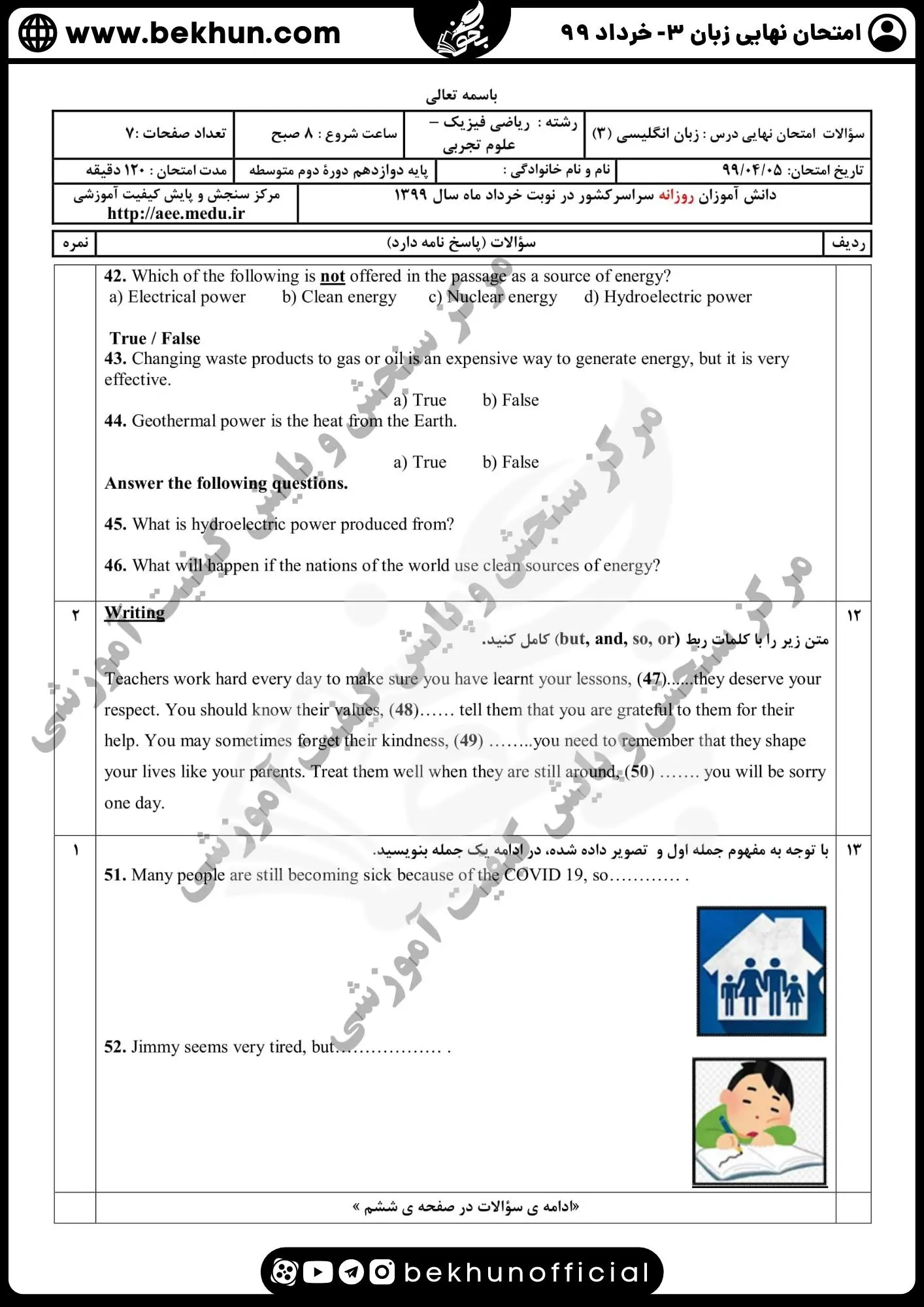 سوالات امتحان نهایی زبان دوازدهم خرداد ماه 99 ریاضی و تجربی