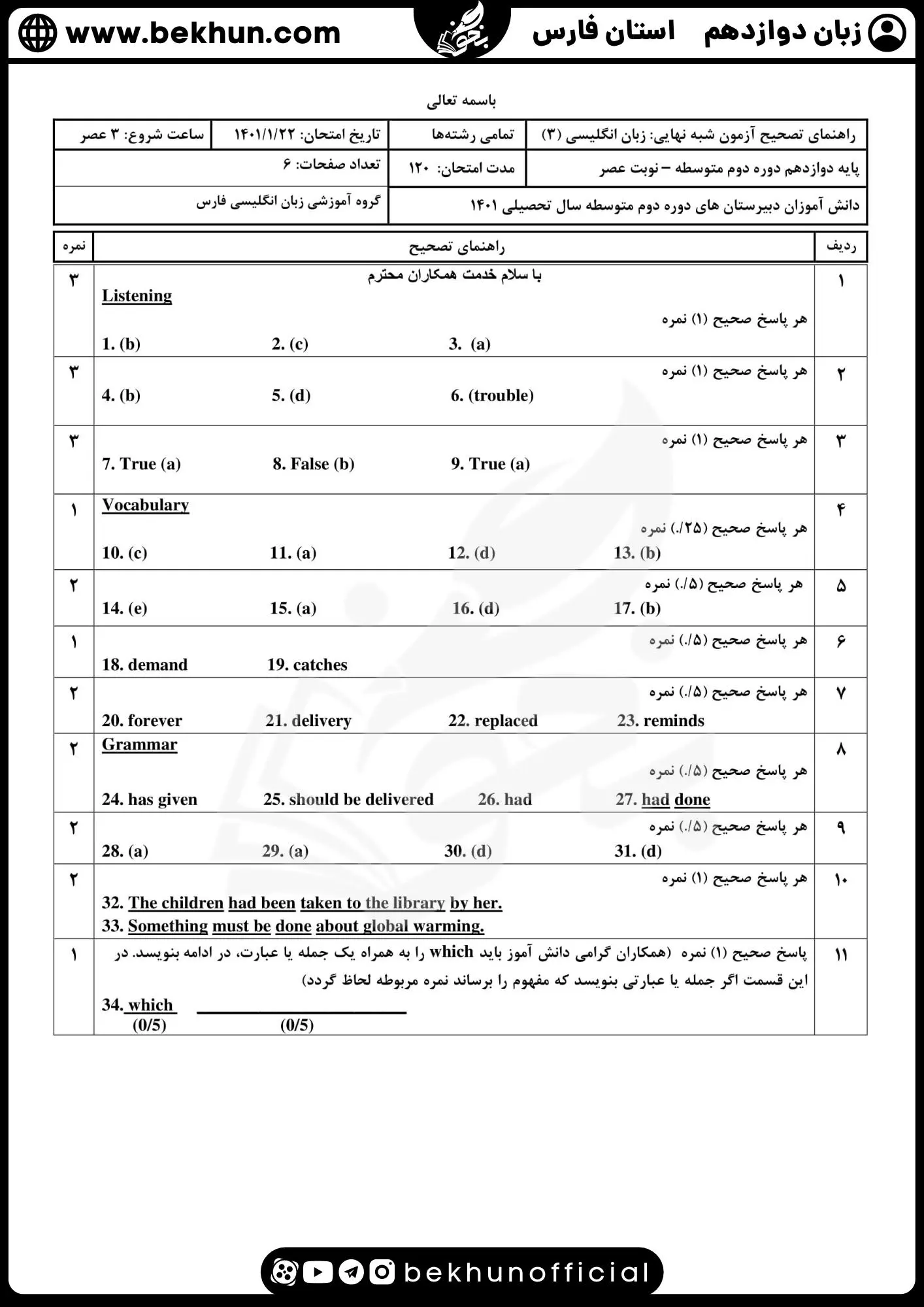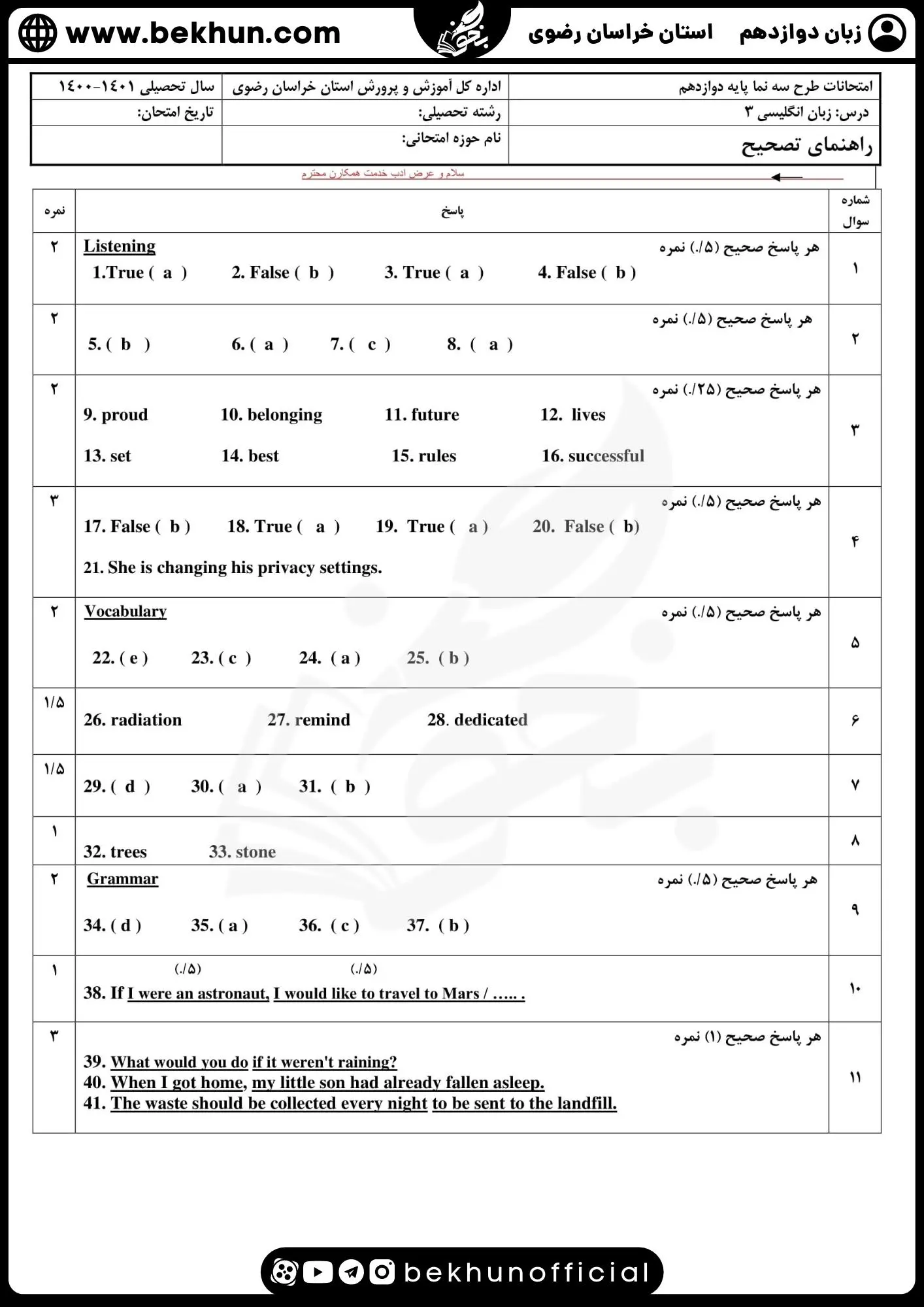 پاسخنامه نمونه سوال زبان دوازدهم خرداد 1401