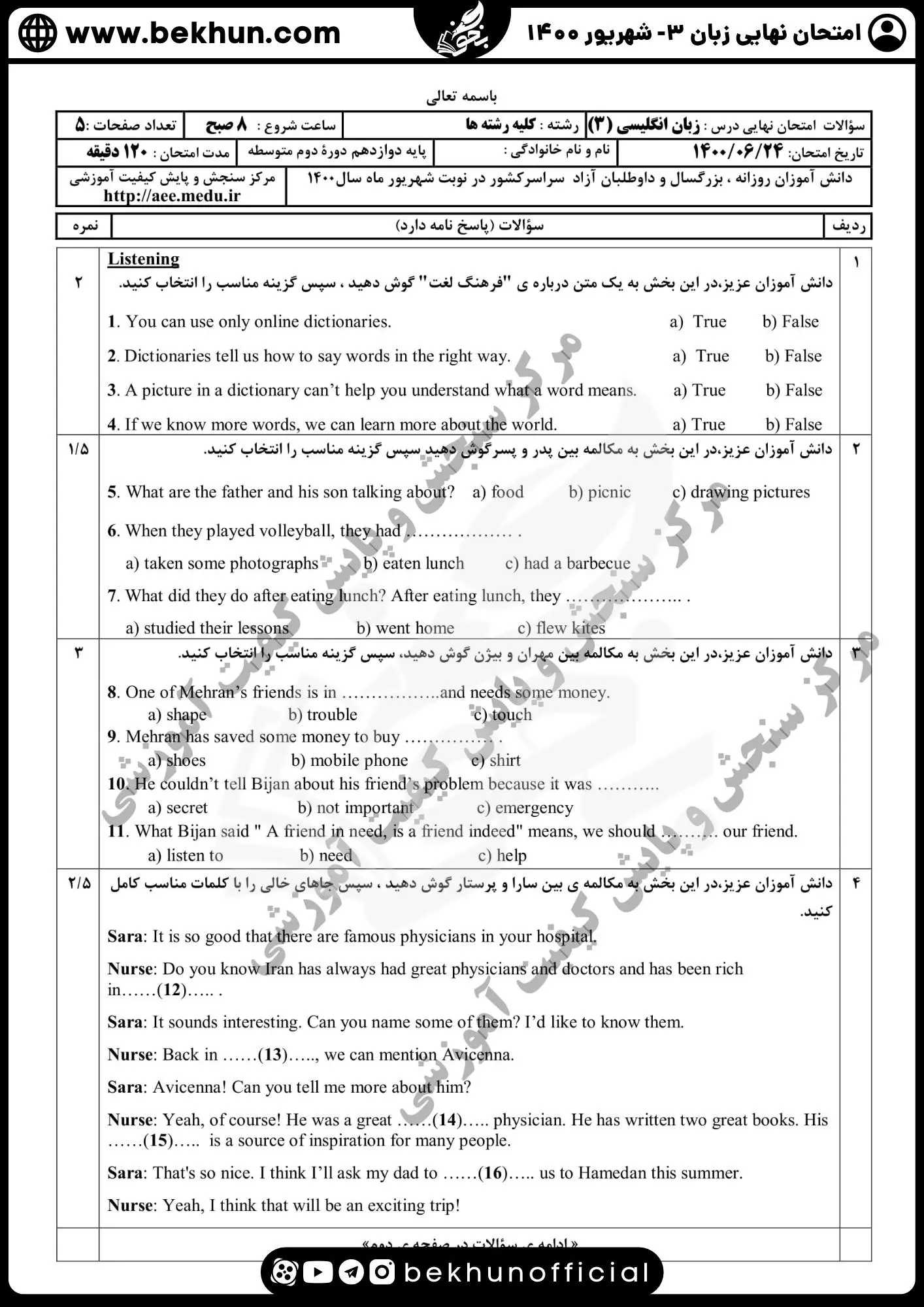 لیسنینگ امتحان نهایی زبان دوازدهم خرداد 1400 رشته تجربی و ریاضی