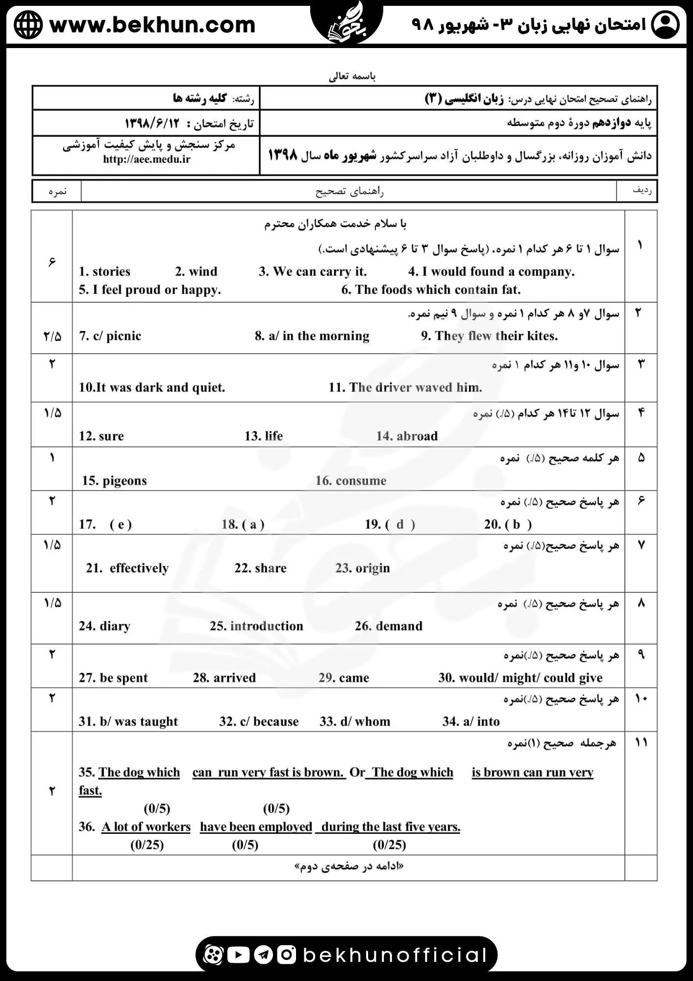 پاسخ نمونه سوال نهایی امتحان زبان دوازدهم شهریور 98