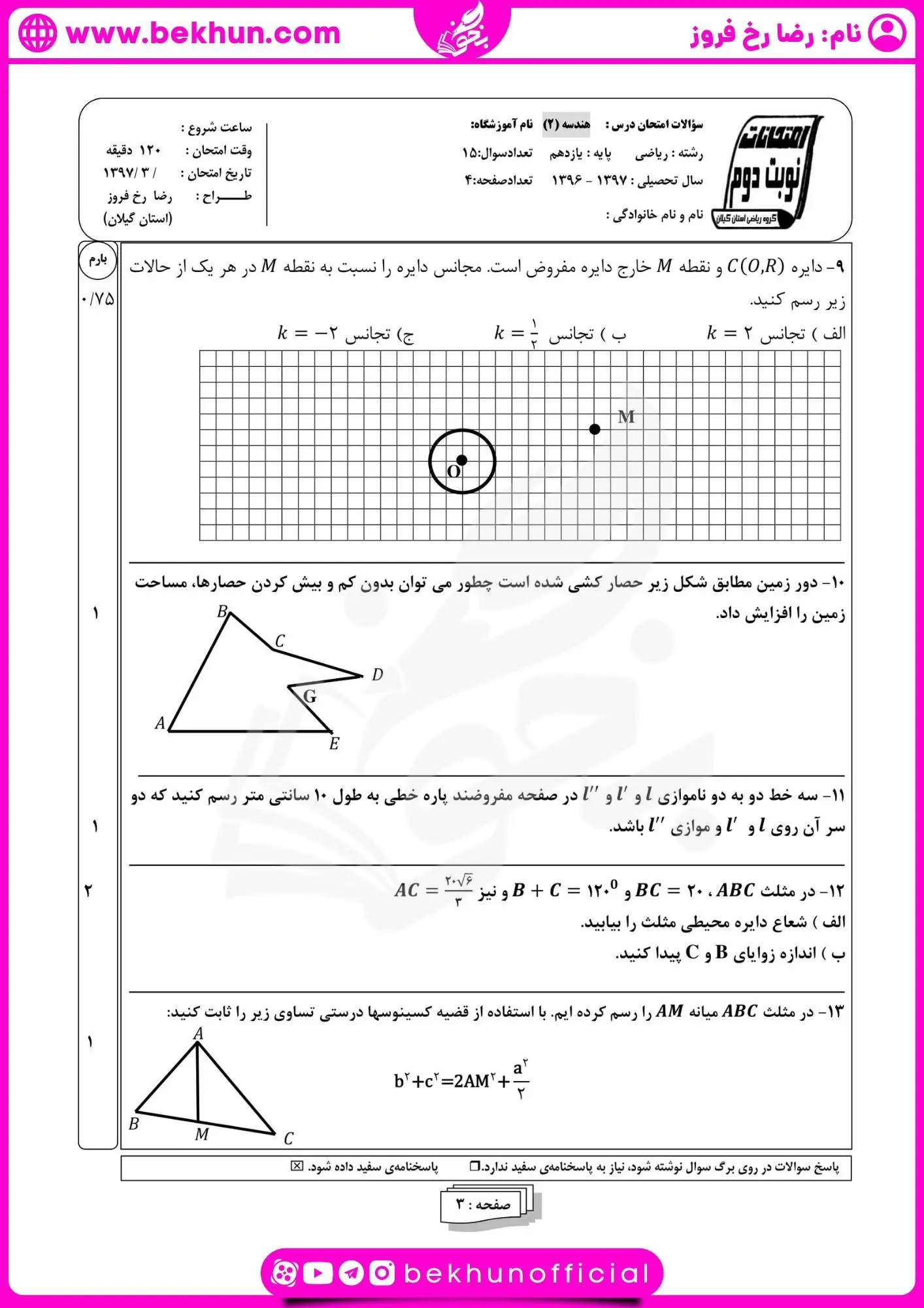 دانلود نمونه سوال هندسه یازدهم خرداد ماه با جواب رضا رخ فروز