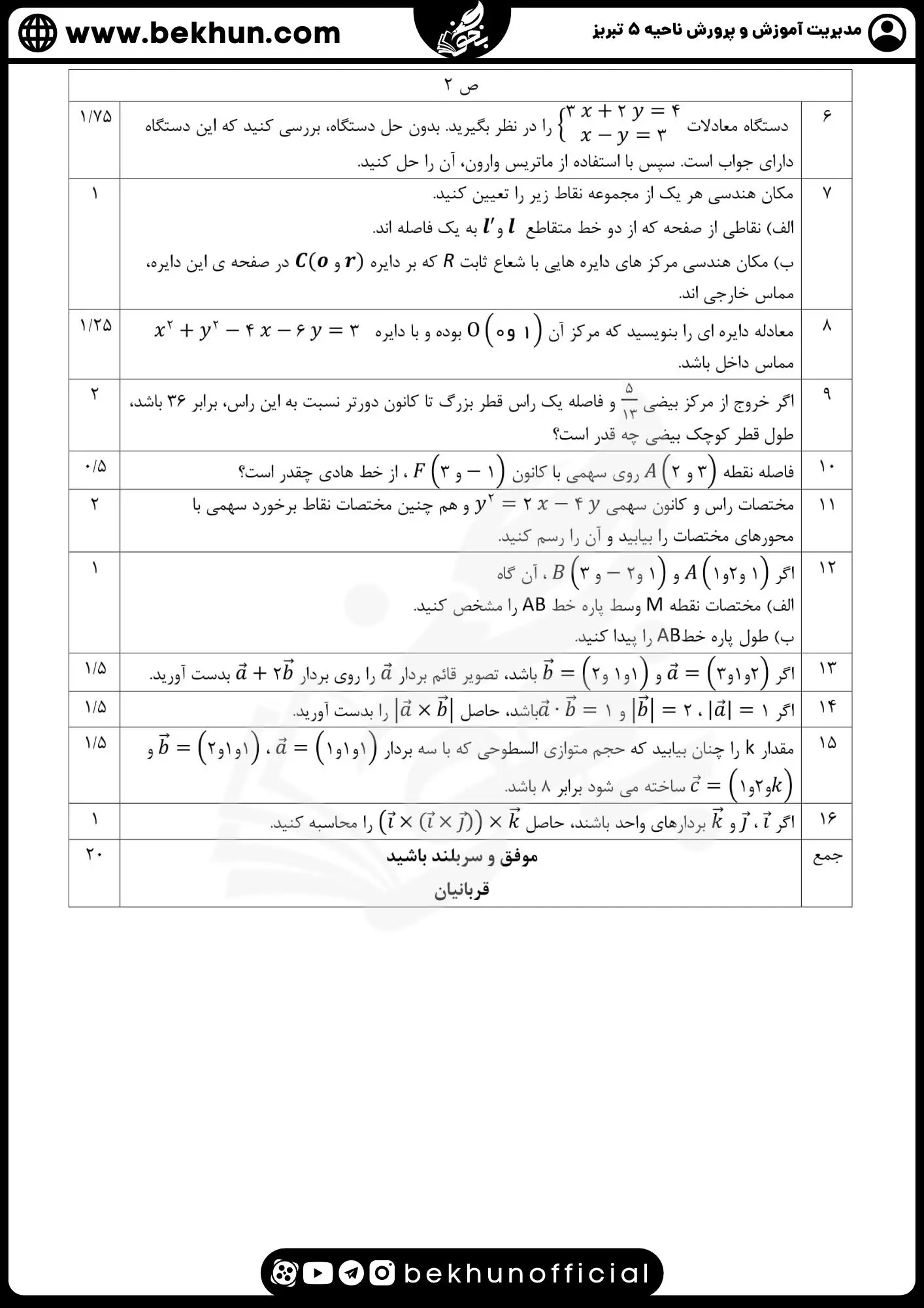 - نمونه سوالات امتحان نهایی هندسه دوازدهم مدیریت آموزش و پرورش ناحیه 5 تبریز