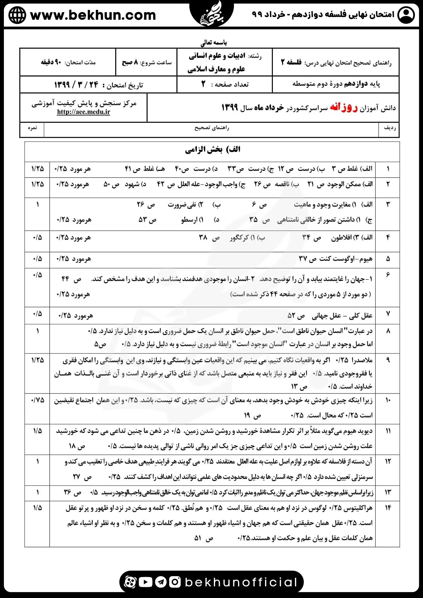 دانلود پاسخنامه نمونه سوالات نهایی فلسفه دوازدهم 1401