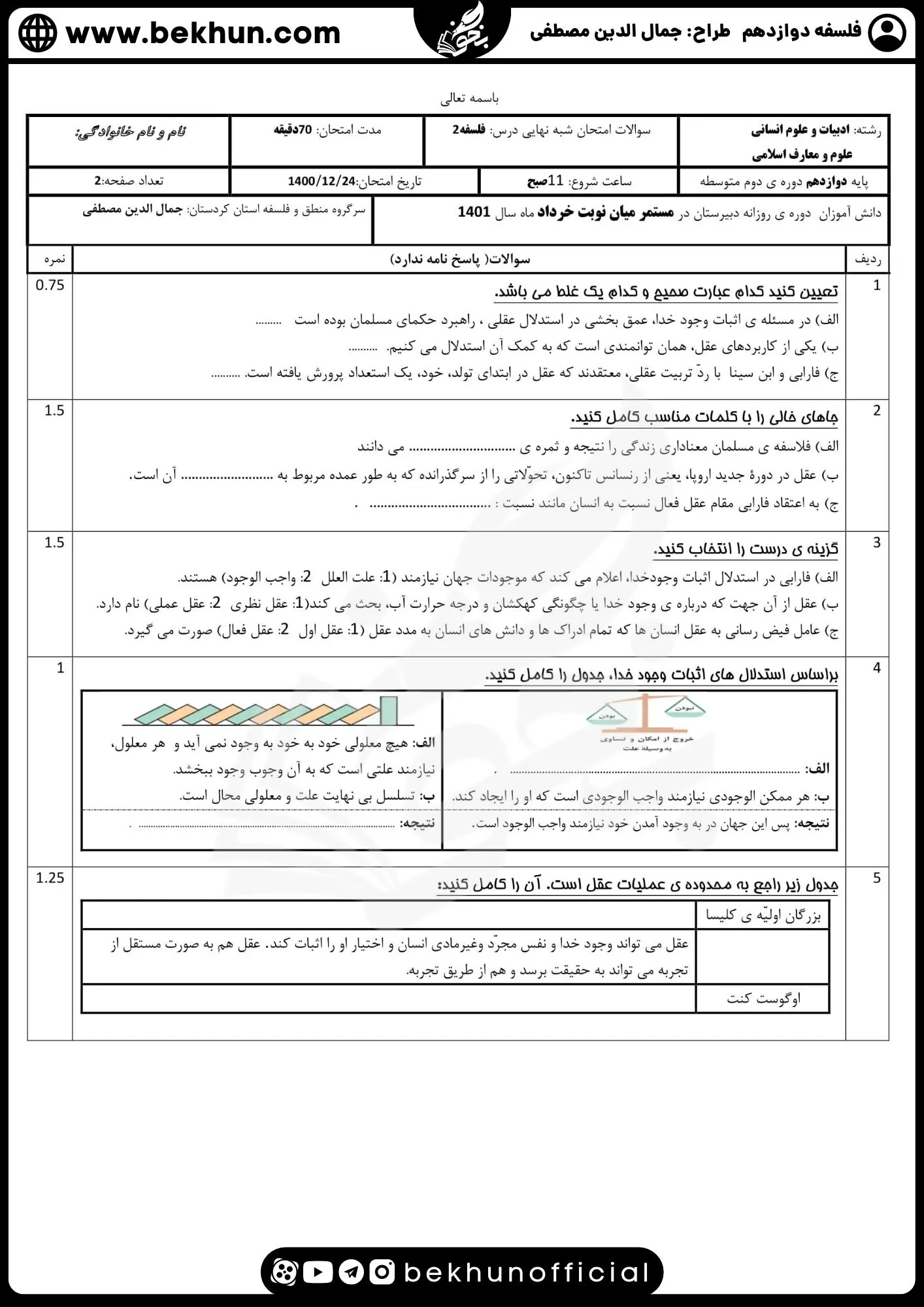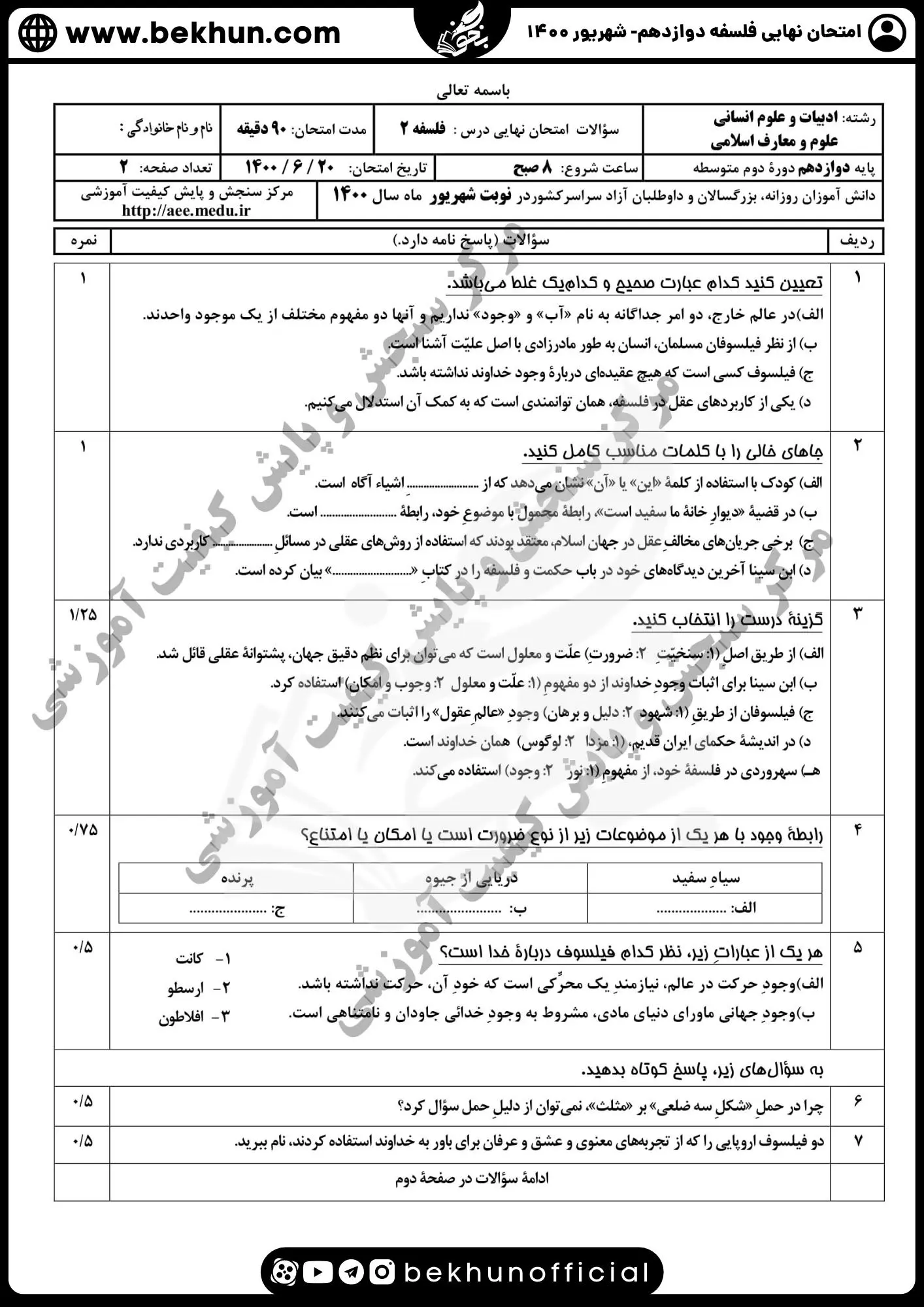 نمونه سوالات فلسفه دوازدهم نهایی 1401