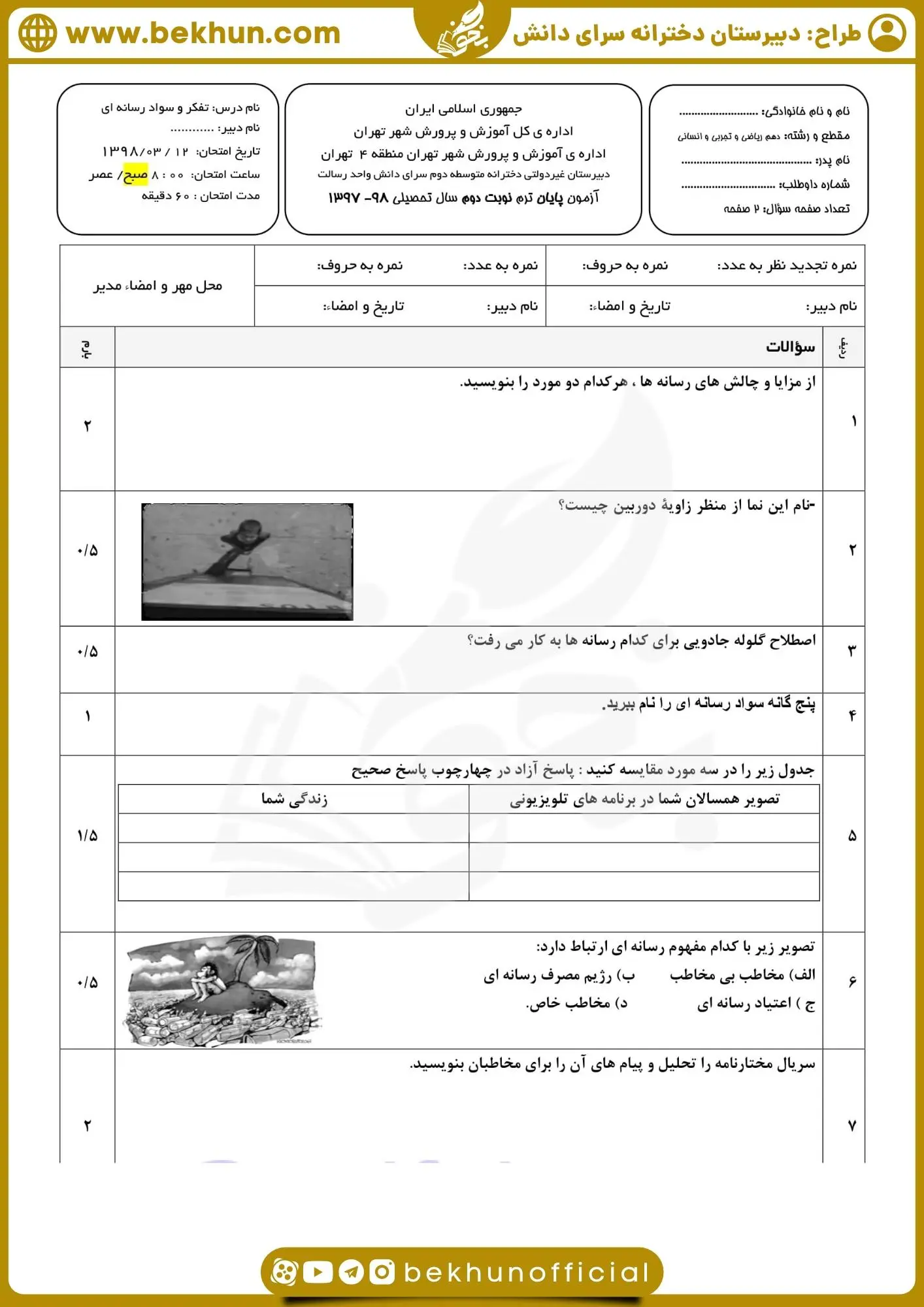 دانلود نمونه سوالات سواد رسانه ای با جواب نوبت دوم با جواب دبیرستان دخترانه سرای دانش
