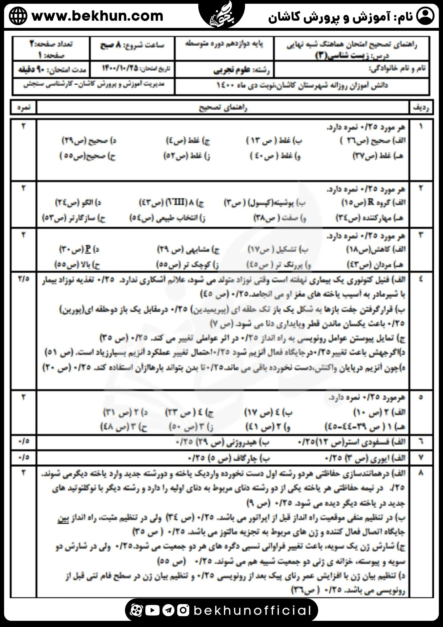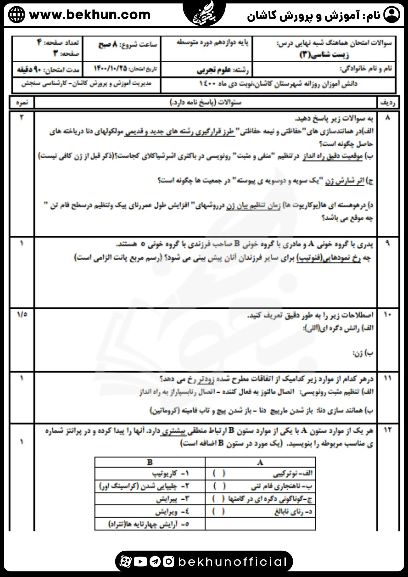 دانلود نمونه سوال امتحانی درس زیستشناسی 3 نوبت اول آموزش و پرورش کاشان