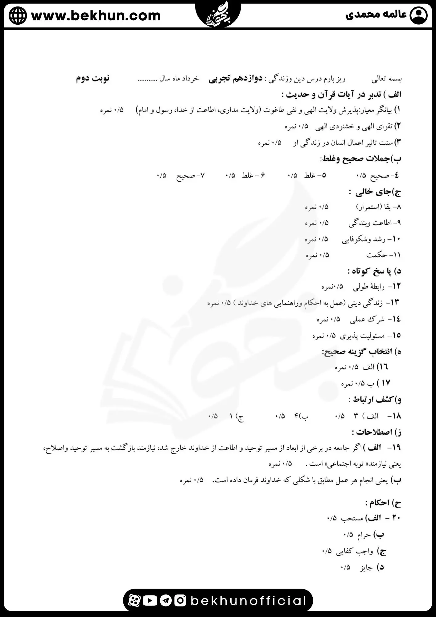 نمونه سوال امتحان نهایی دینی دوازدهم تجربی با جواب استاد فرحناز بردبار