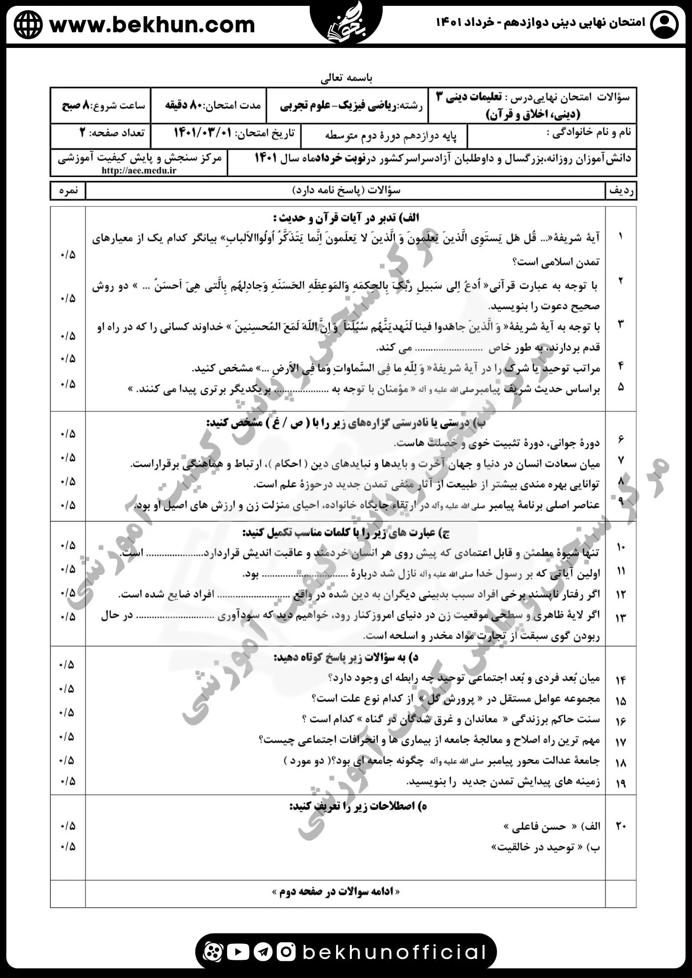 - نمونه سوالات نهایی دینی دوازدهم ریاضی و تجربی